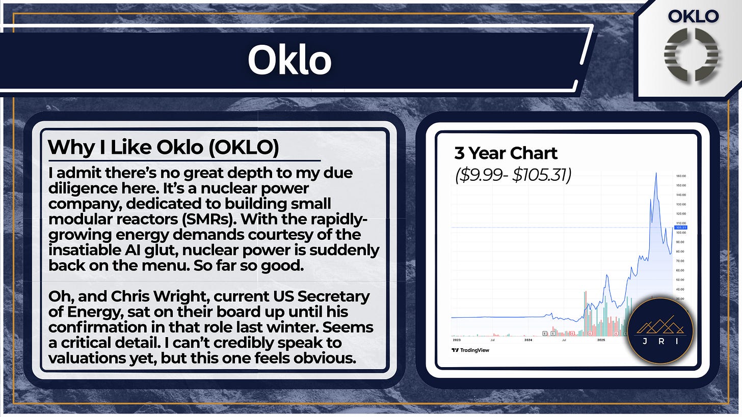 Some Sunday morning coffee reading for you. I’ve built profile cards for 11 companies I’m shoulder-tapping for 2026 that match the themes I’m approaching the year with. I’ve tried to present a range of options for you, so hopefully there’s something that matches your risk profile. Paid subs - I have some high-confidence trade opportunities I will be writing up soon above and beyond these ideas. Watch for those soon.