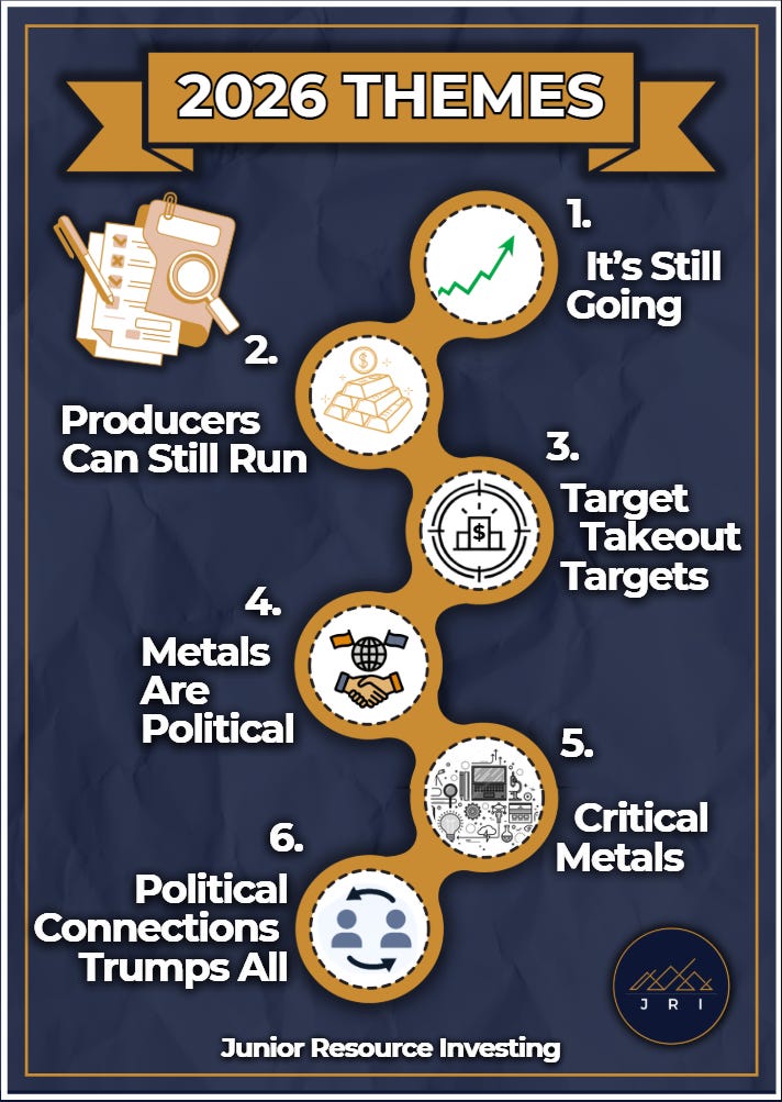 Alright, there’s no shortage of both plays and ways to play this game, so I am going to break down my approach to 2026 into a few different themes. But above and beyond all else, so long as the market stays standing, I believe this metals bull run is still mid-stride. So stay focused, stay disciplined, and keep taking advantage of being in this sector at such a time.