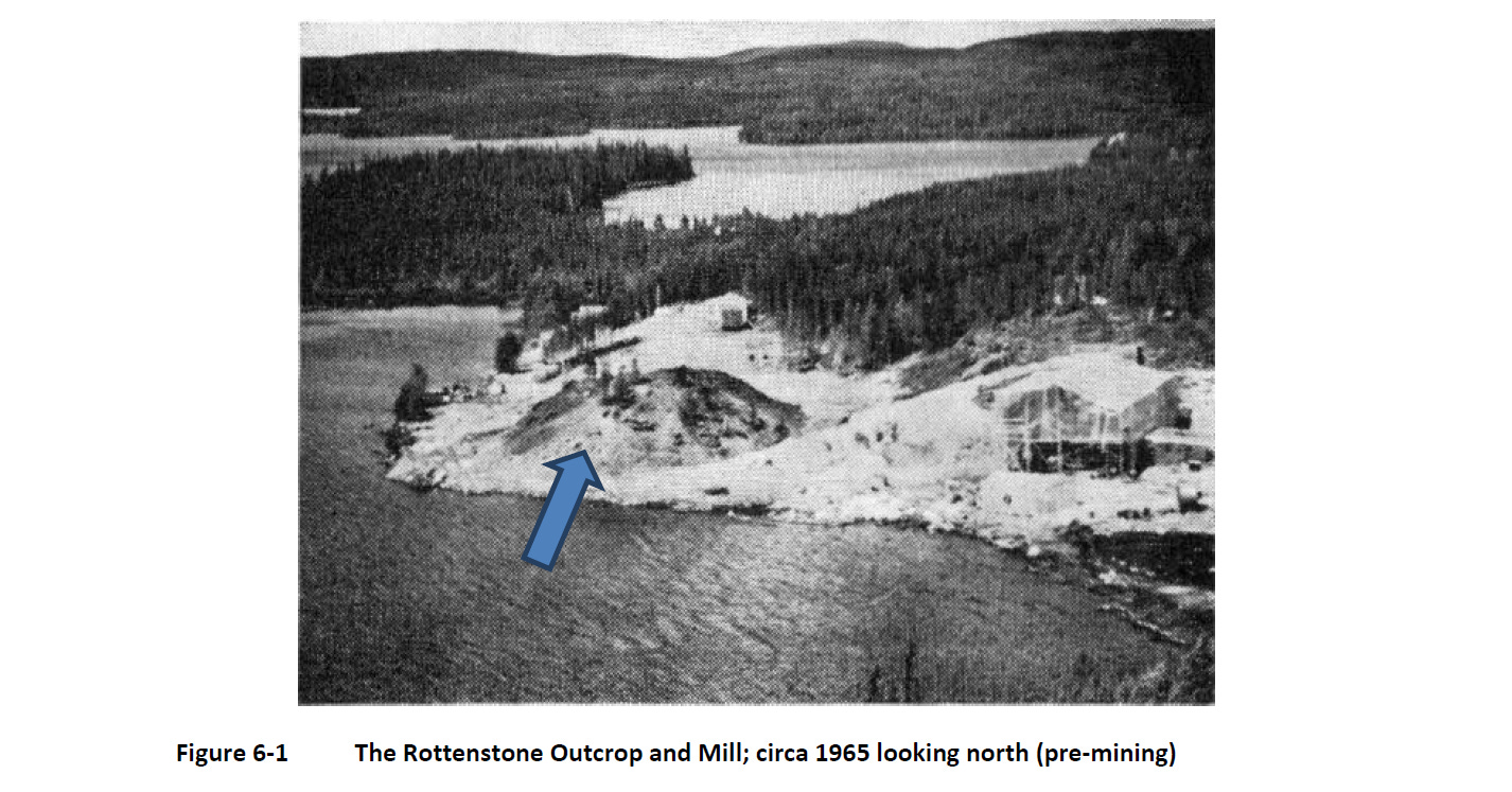 4.5 km south of historic Rottenstone: “The Dime”. 13 meters of Ultramafic rock that contained 0.5% nickel with very minimal sulfides. 1% sulfides with 0.5% nickel is potentially a very, very high metal tenor/concentration. (tenor = how much nickel in 100% sulfide).