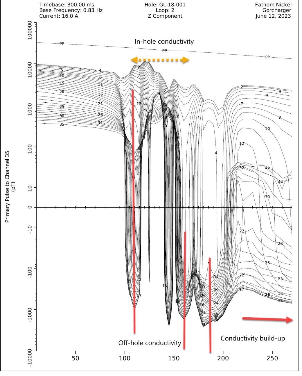 BHEM “had never really been used systematically before”. Other things like drilling on ice. BHEM has been “tremendous”, though. Having it real time is a game changer. We know that these semi-massive to massive sulphides contain nickel. We know they respond beautifully to the BHEM and that it is pointing us to zones of conductivity.