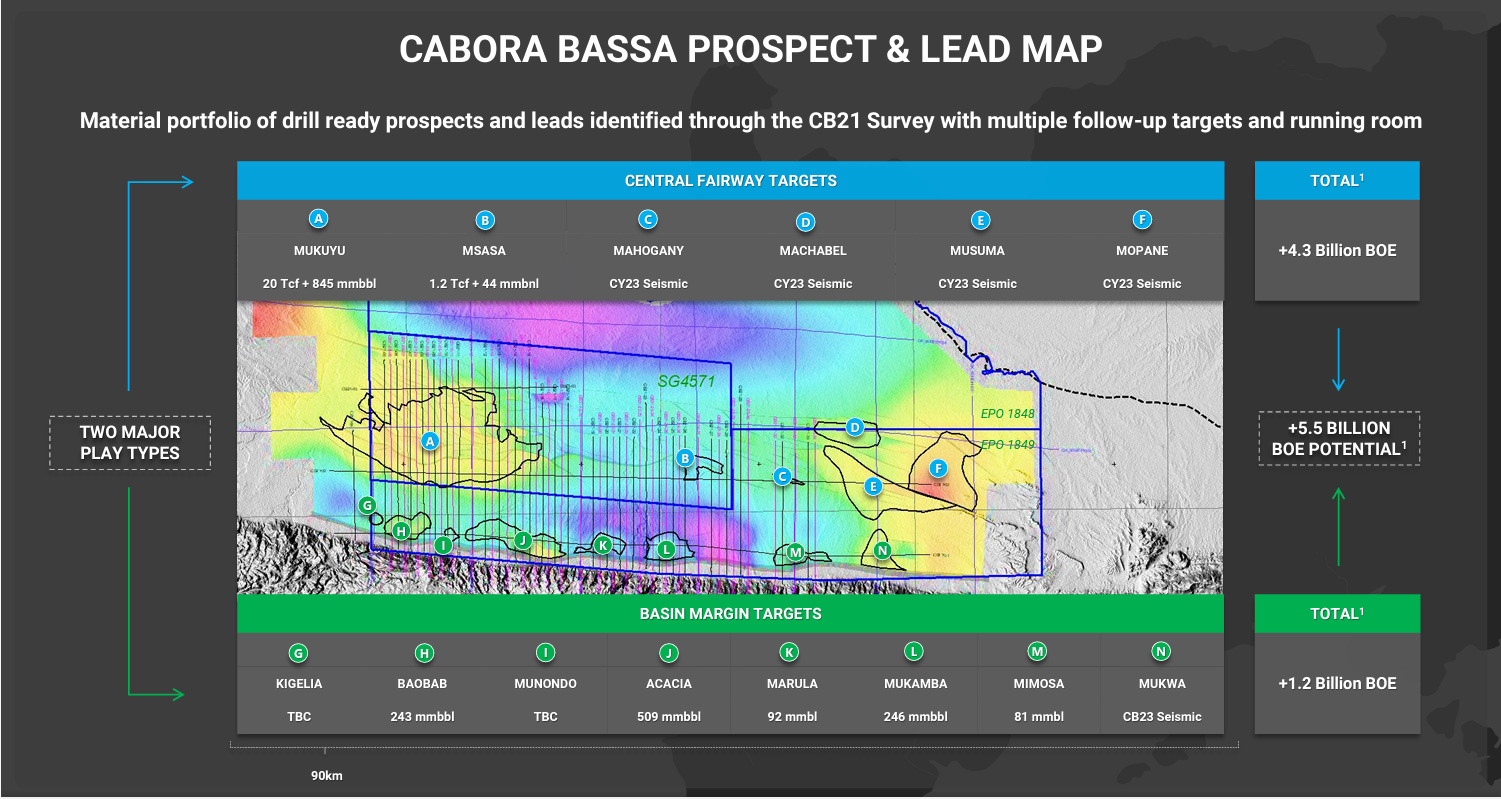 Thankfully, this debate is irrelevant to this article because Invictus is after some huge prospects. As the map below shows, there is over 5.5 billion boe in Invictus’ land package, with that number looking to potential raise - significantly even - with ongoing above and below ground exploration of the Cabora Bassa basin. Take a look through the targets below to get a sense of them.